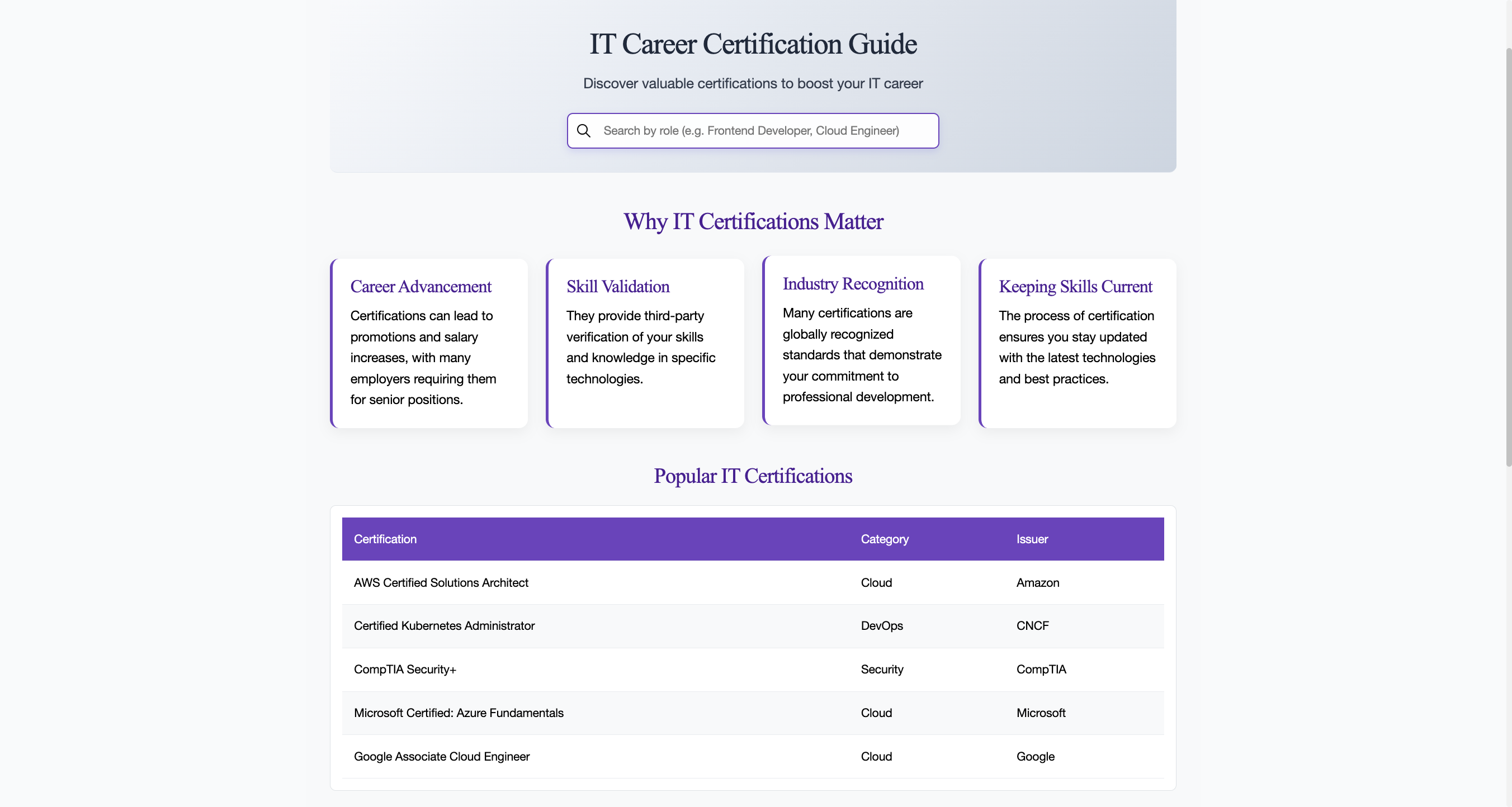 - Content: Created interactive portfolio timeline and certification guide