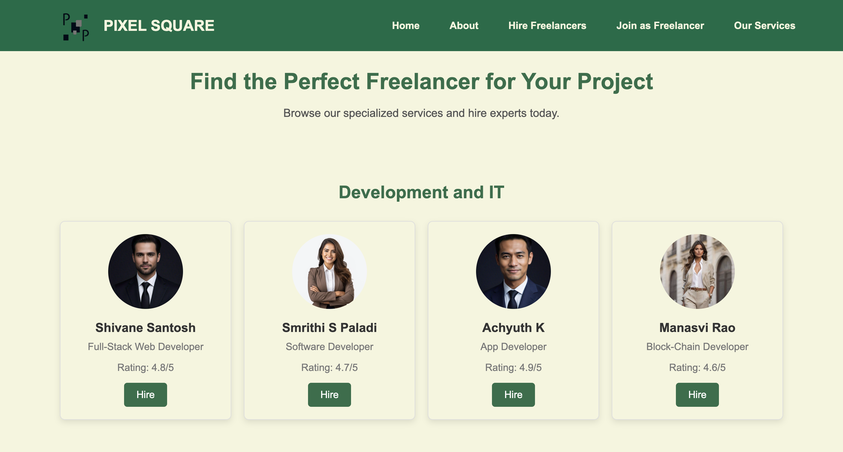 - Interactive freelancer cards with ratings and hire buttons