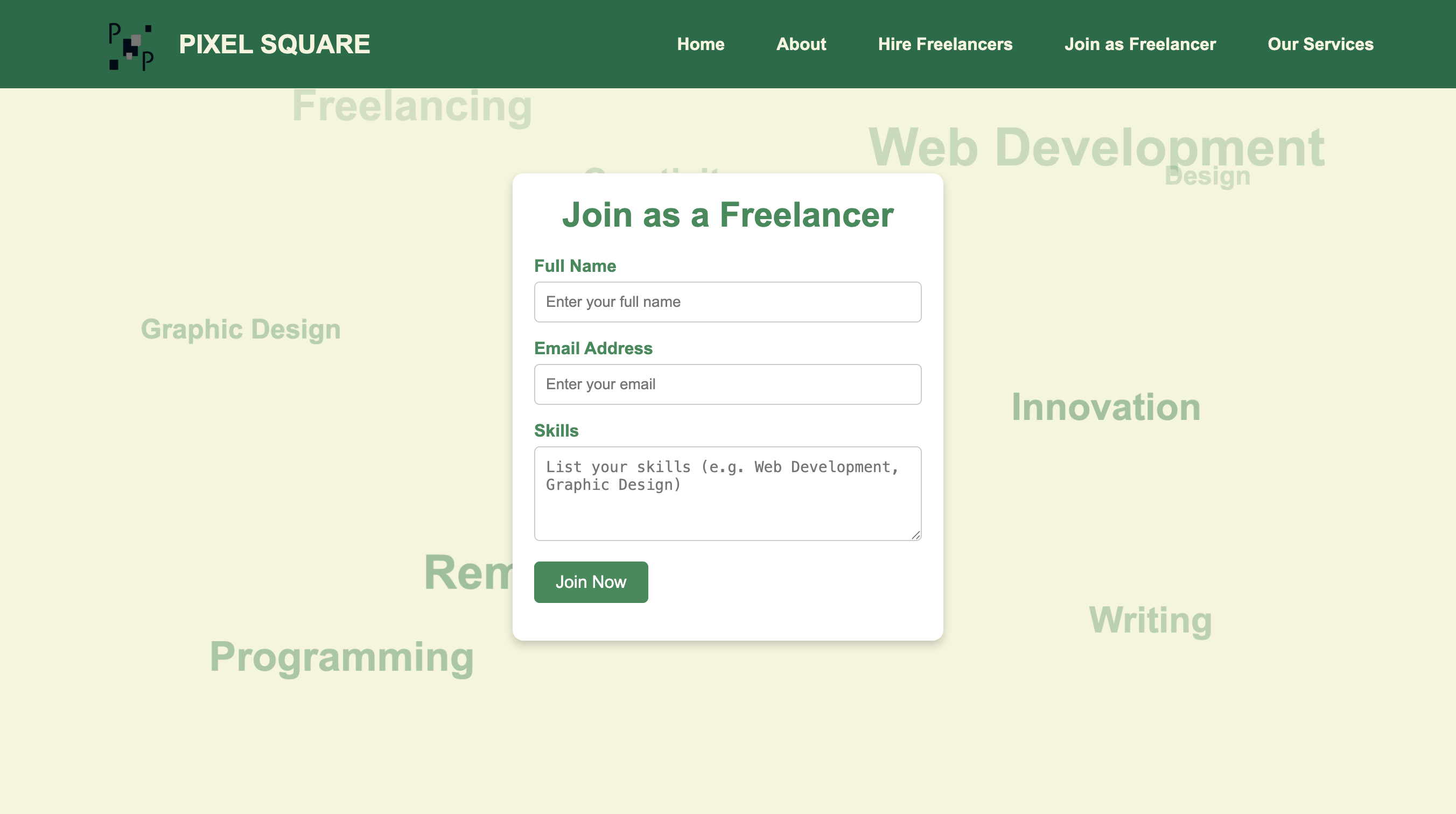 - Navigation: Created multi-page architecture with Home, About, Hire, Join, and Services